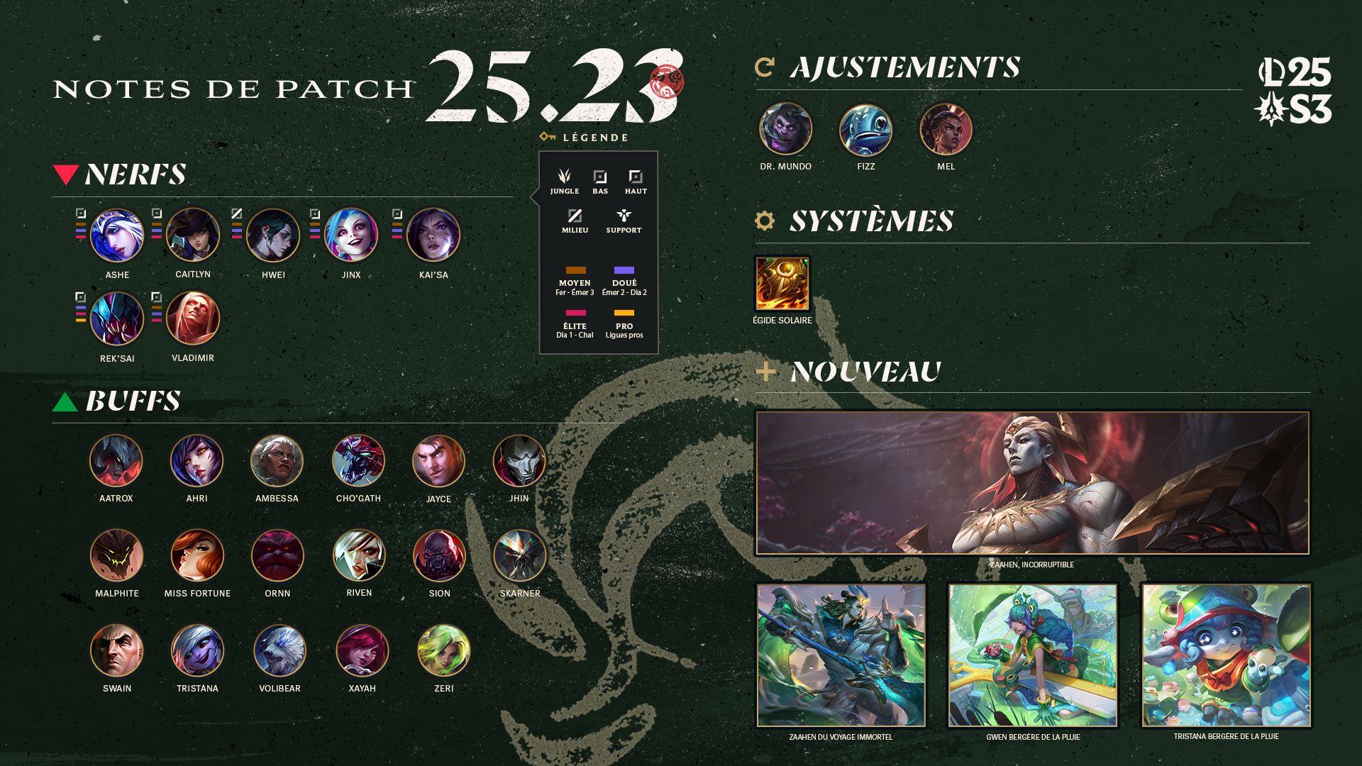Petite anecdote : la MVG d’Aatrox avait pour but de le rendre viable dans la jungle au début de son développement, mais au final, il s’est retrouvé sur la voie du haut. C’est un champion très intéressant, avec de chouettes mécaniques, alors nous diminuons certains paliers de PV max et ajoutons un peu de boost dans la jungle pour voir comment il s’en tire dans son nouveau rôle.
